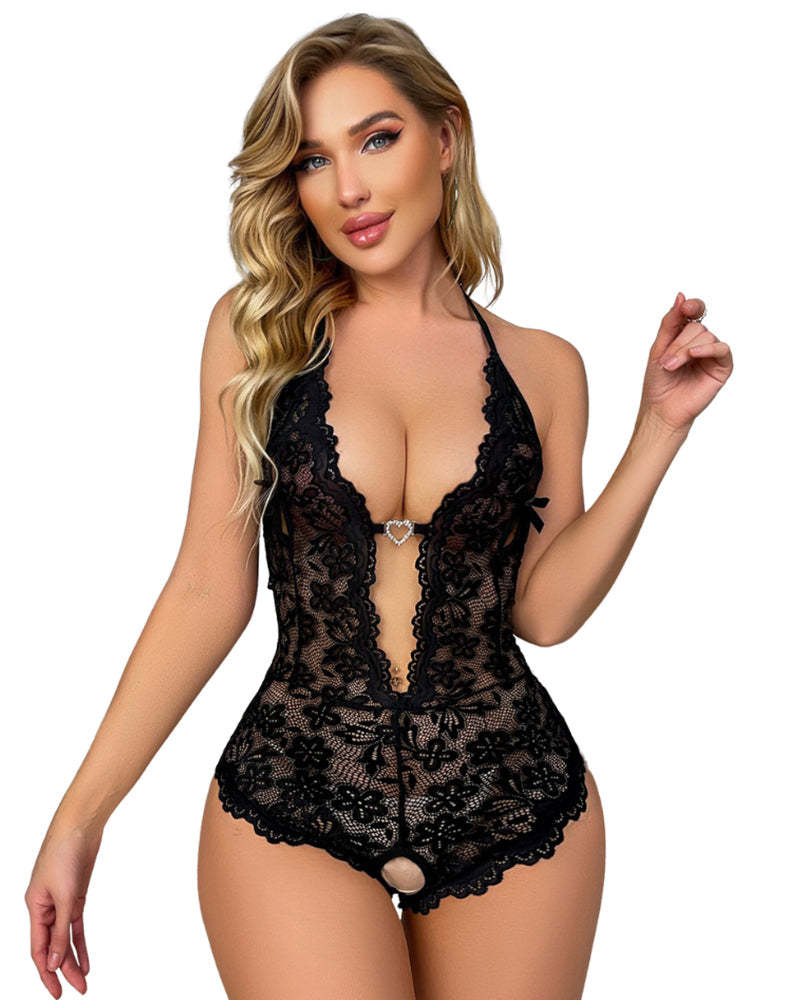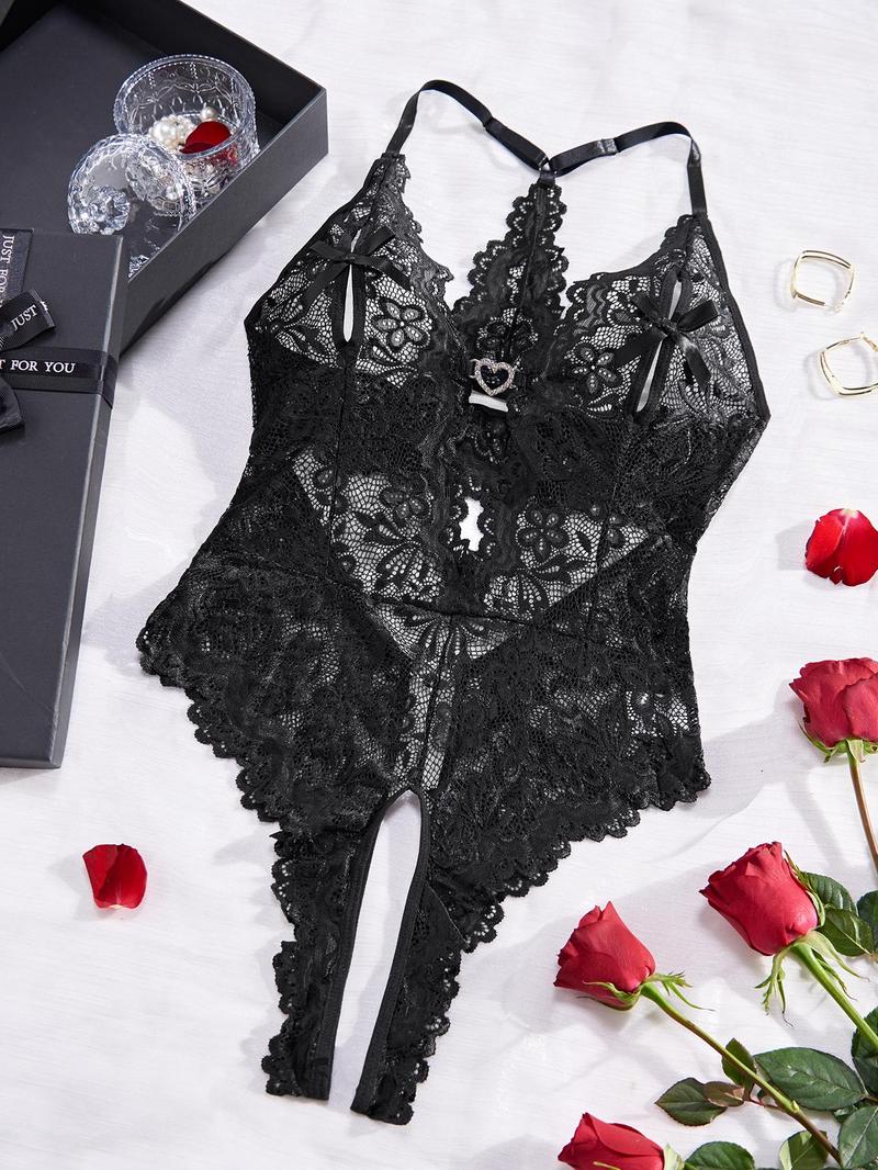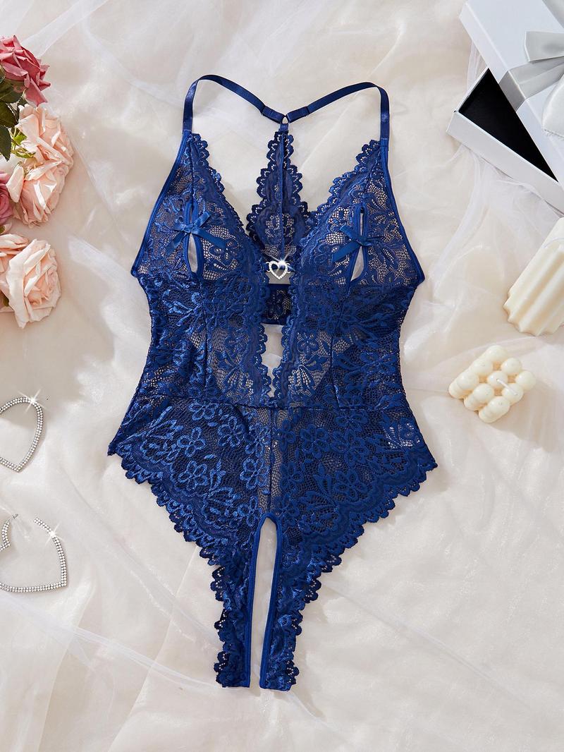Bridal Floral Lace Scallop Trim Cutout Sheer Crotchless Teddy