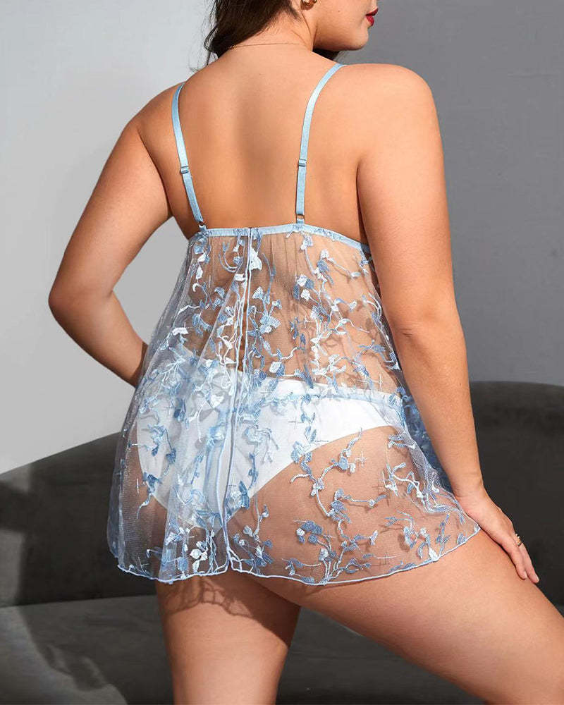 Plus Size Light Blue Embroidered Transparent Strap Dress & Thong Set – Sexy Two-Piece for Women