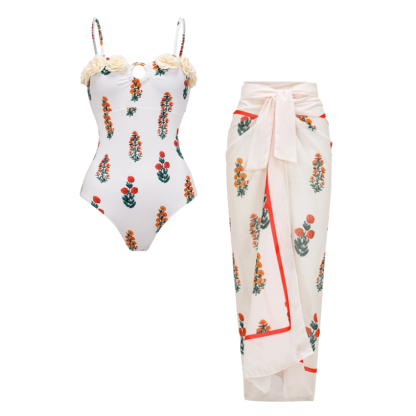 Flaxmaker Flower decor Printed One Piece Swimsuit and Sarong