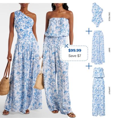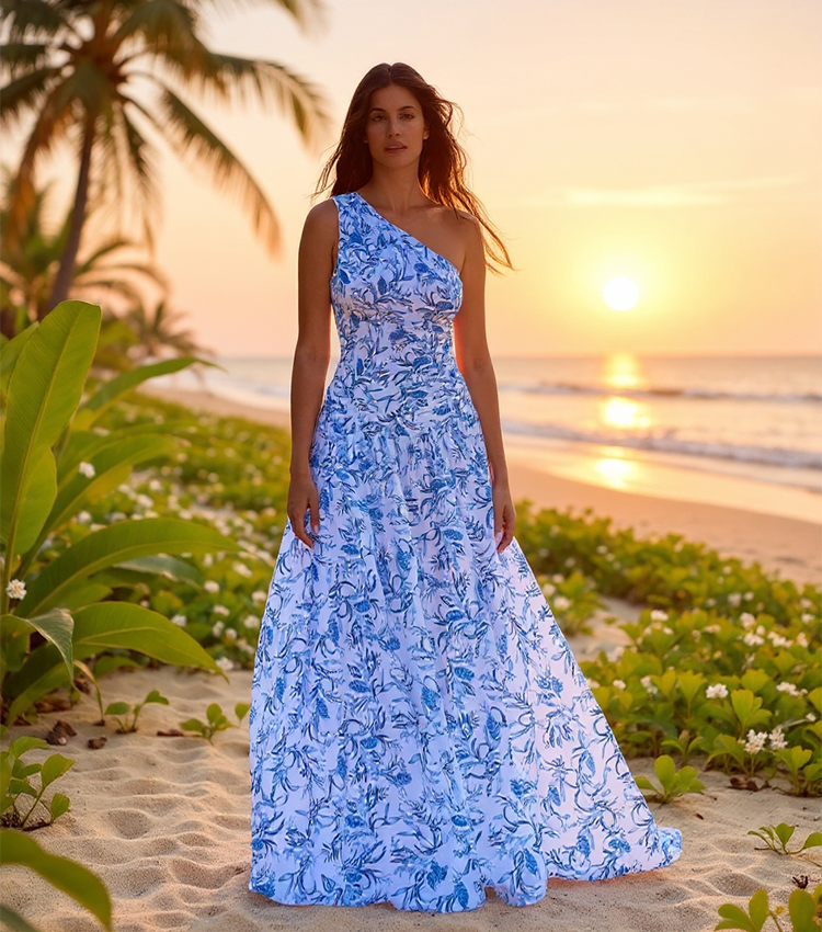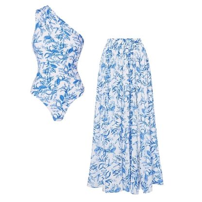 Oblique Shoulder Printed One Piece Swimsuit and Skirt