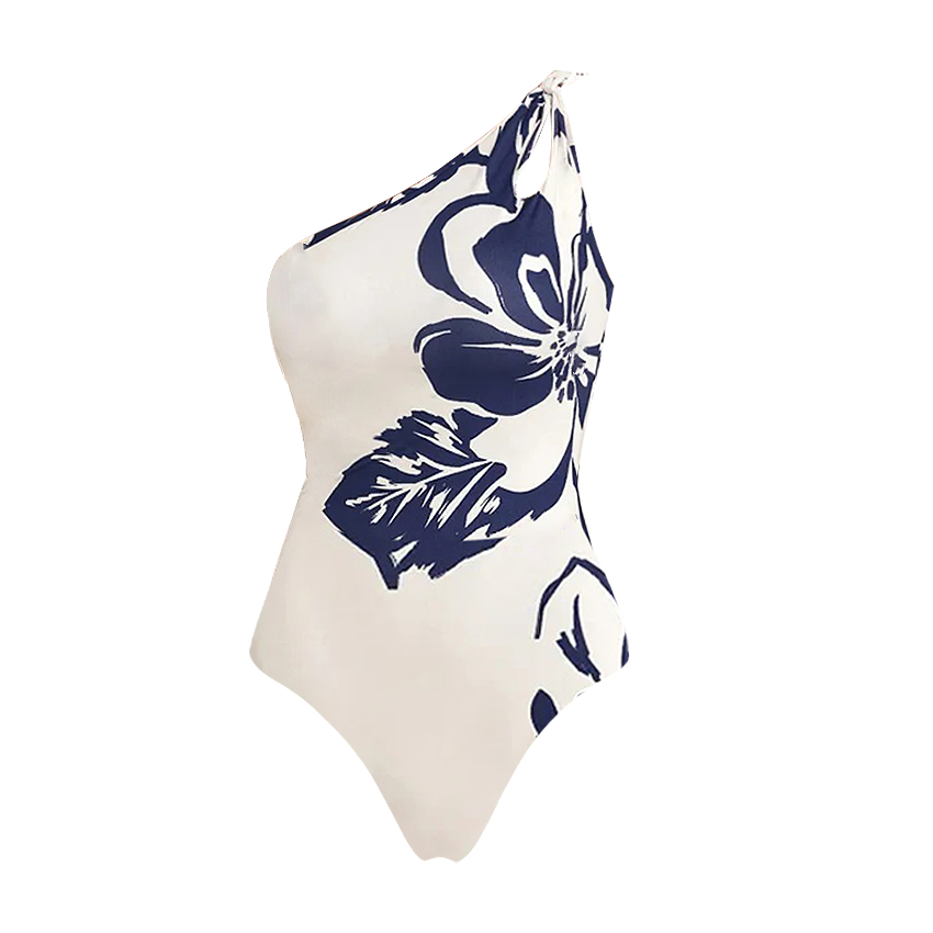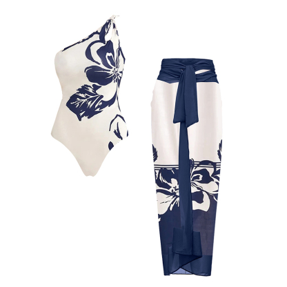 One Shoulder Cut Out Blue Flower Print Swimsuit Set(s)