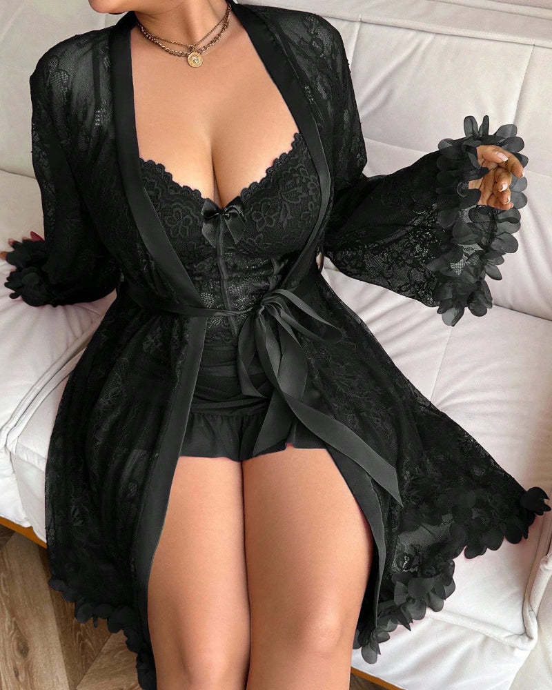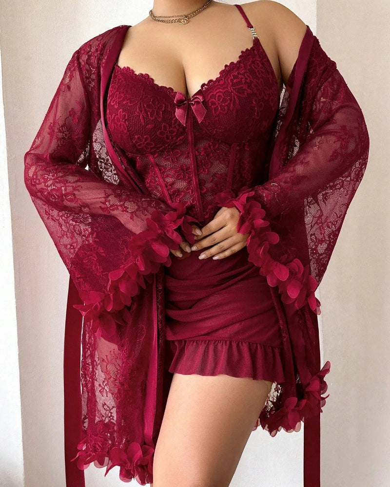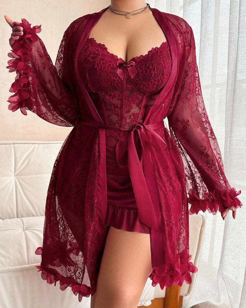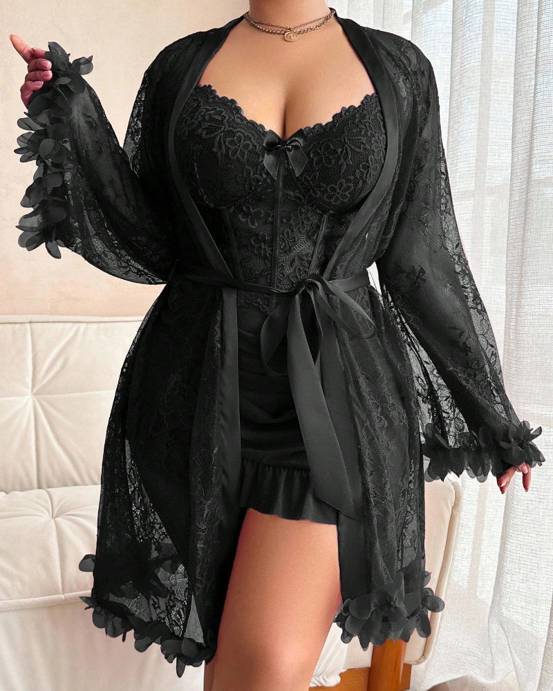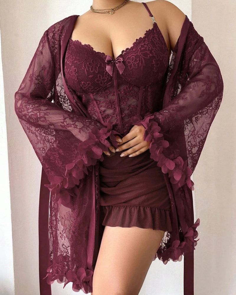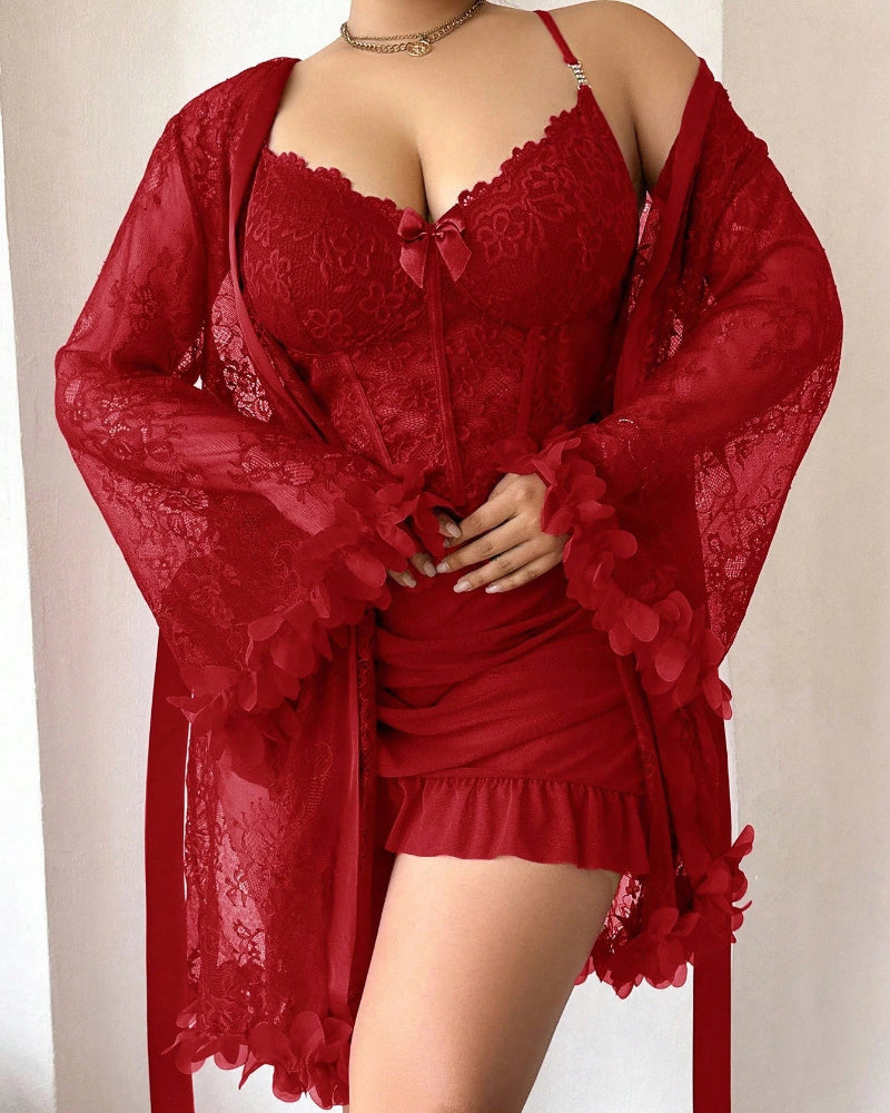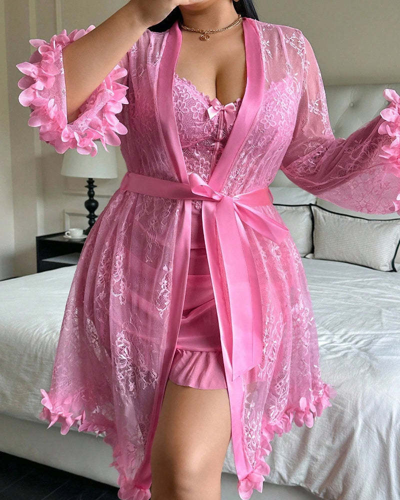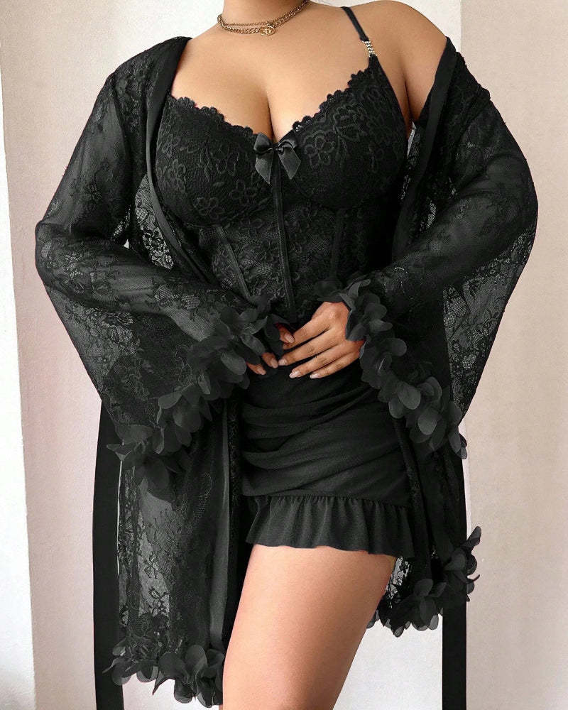 Plus size Lace Cami Nightgown & Floral Lace Trim Wide Sleeve Sheer Robe