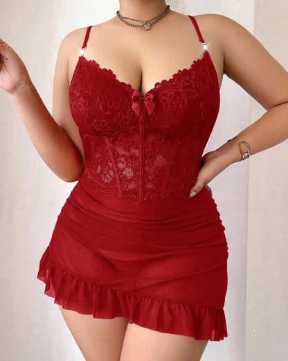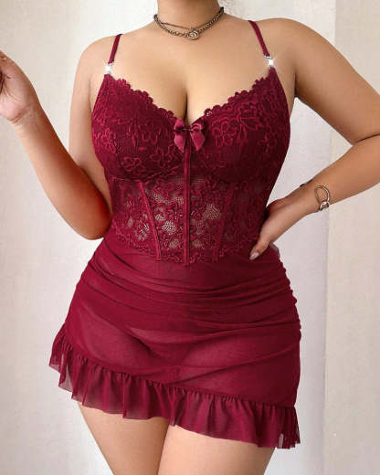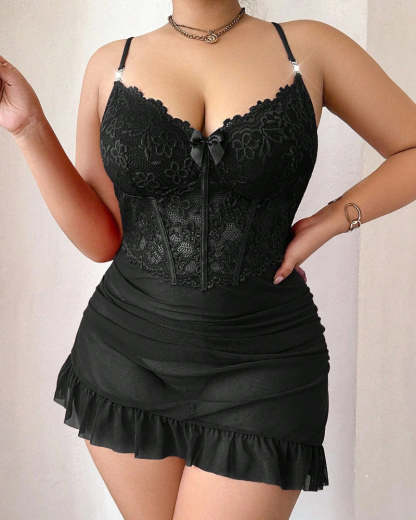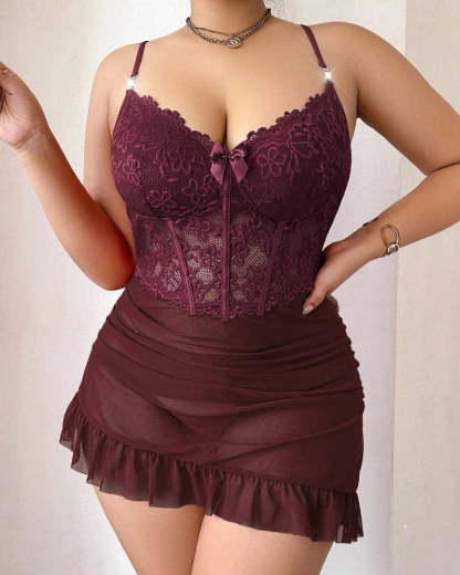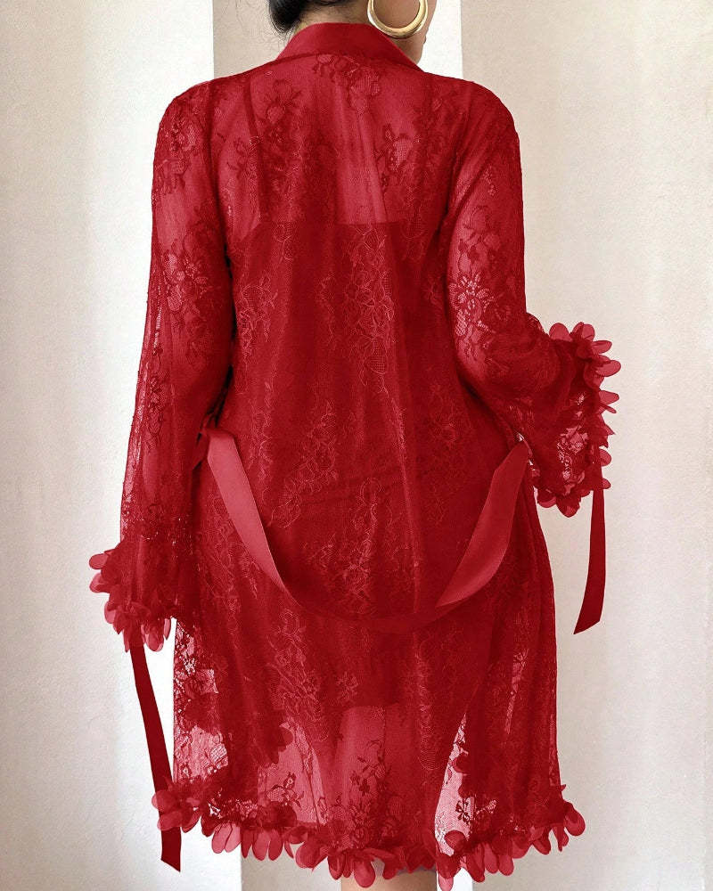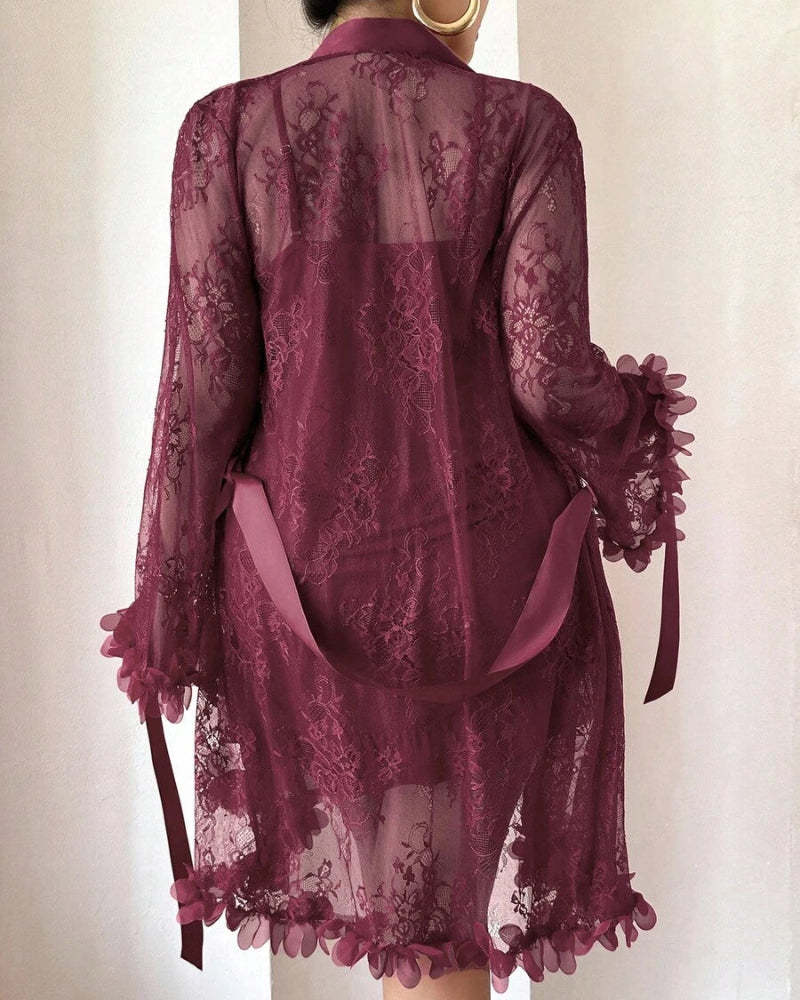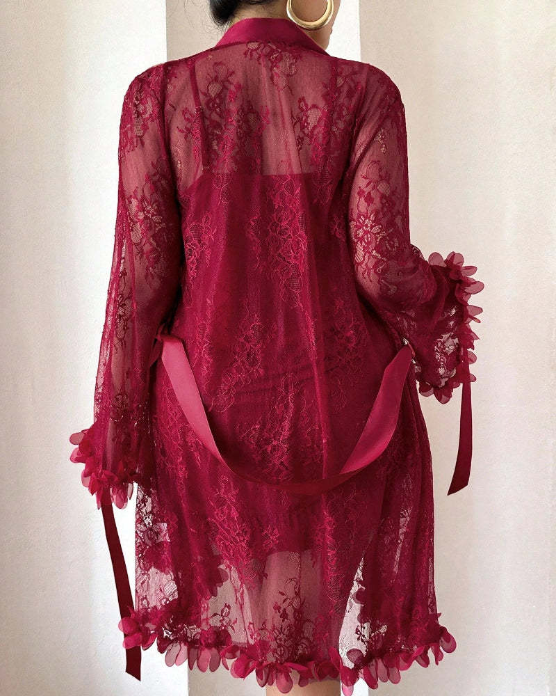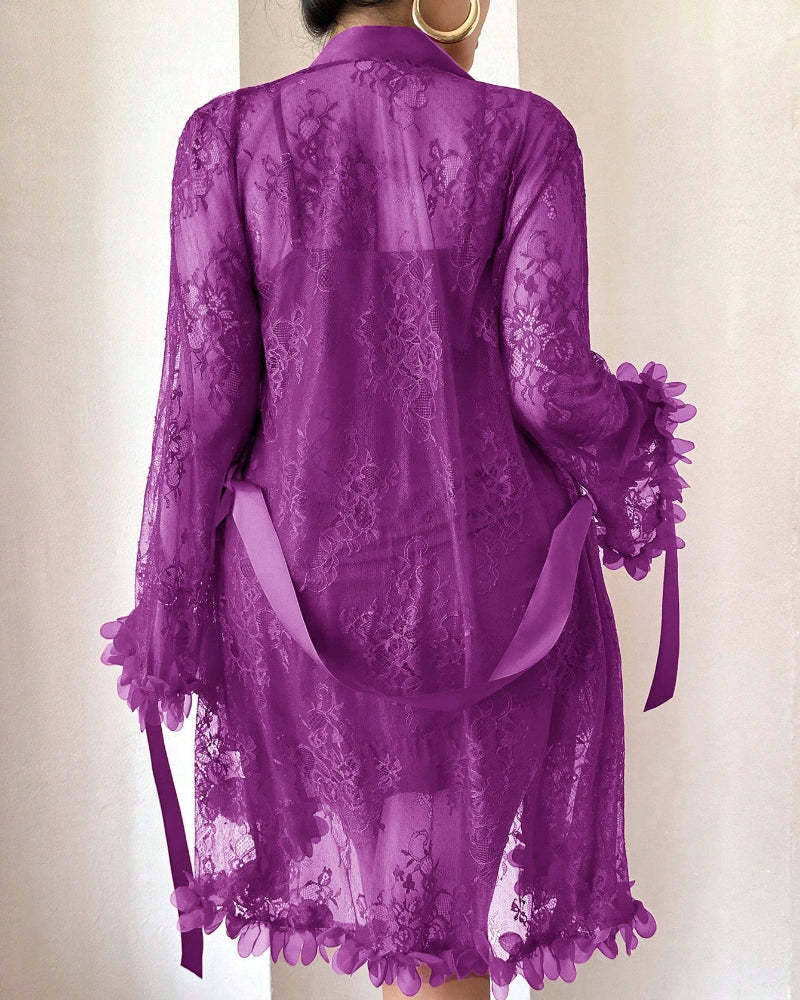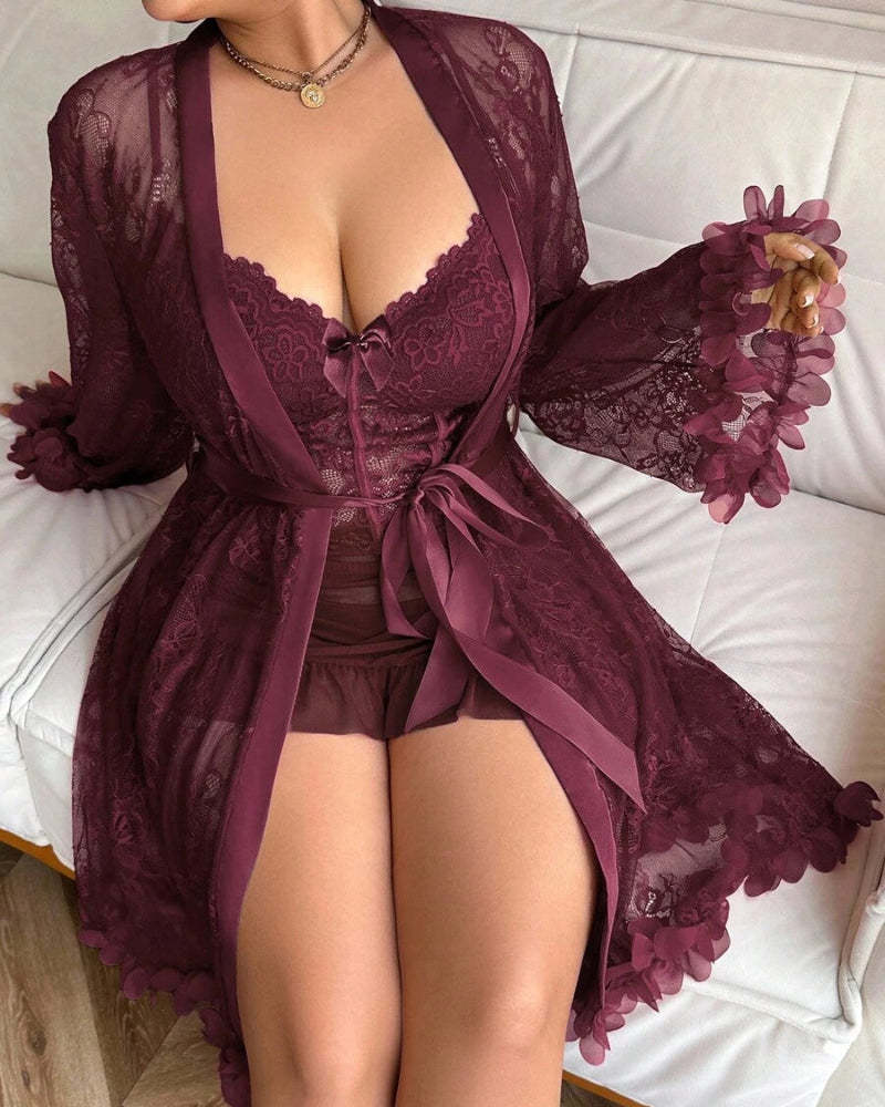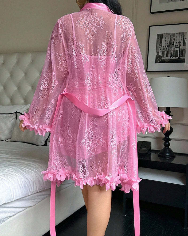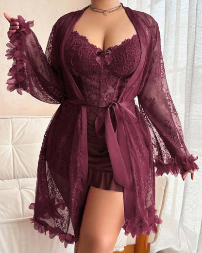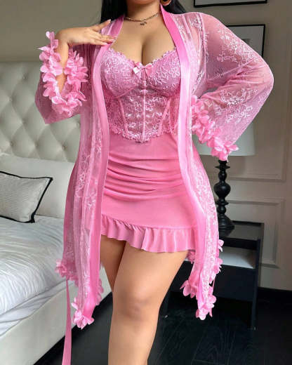 Plus size Lace Cami Nightgown & Floral Lace Trim Wide Sleeve Sheer Robe