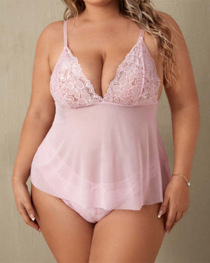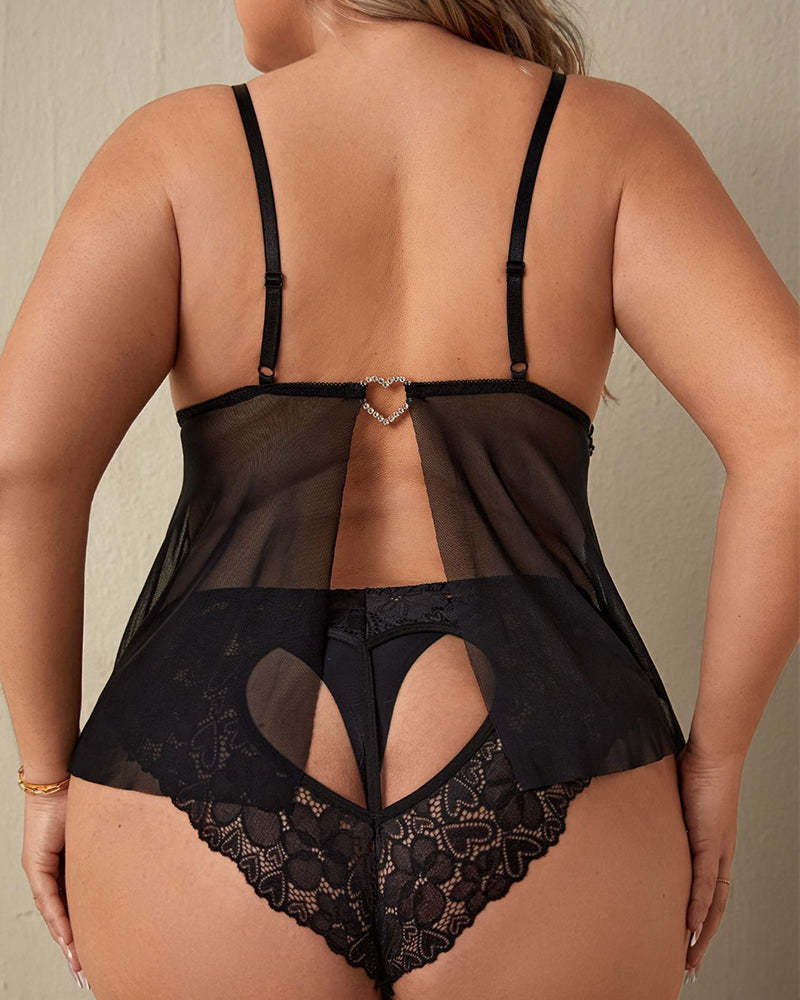 Sexy Plus Size Sheer Lace Cami Dress & Heart Panty Set