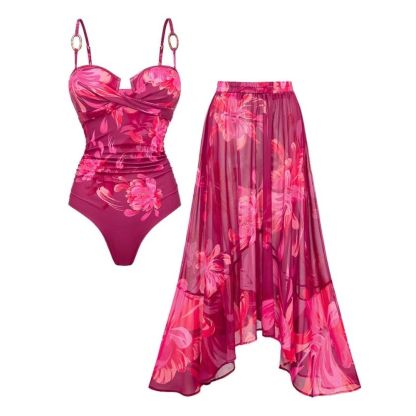 Sling Abstract Floral Print One Piece Swimsuit and Skirt